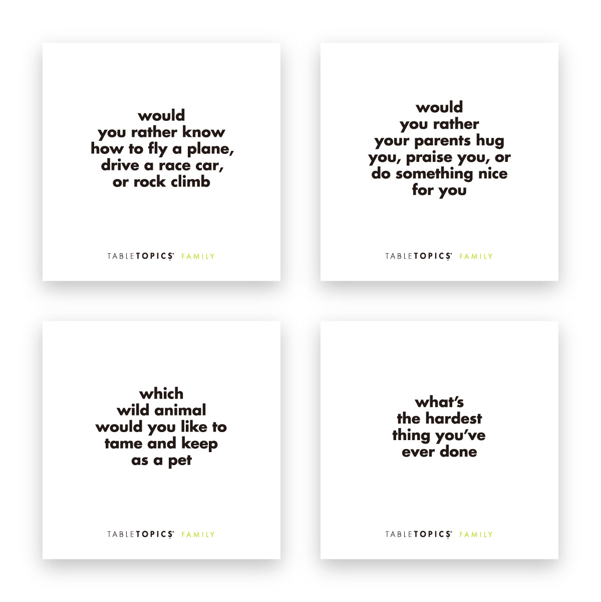 TableTopics® are fun conversation starters for any and every occasion. Our thought-provoking questions have helped millions of people spark engaging, meaningful conversations. Each themed conversation starter set and Prompted™ Journal is full of questions you would have never thought to ask, and the best part is that you’ll get to know your friends, family, and even yourself better. So, skip the small talk — enjoy connecting through great conversation.