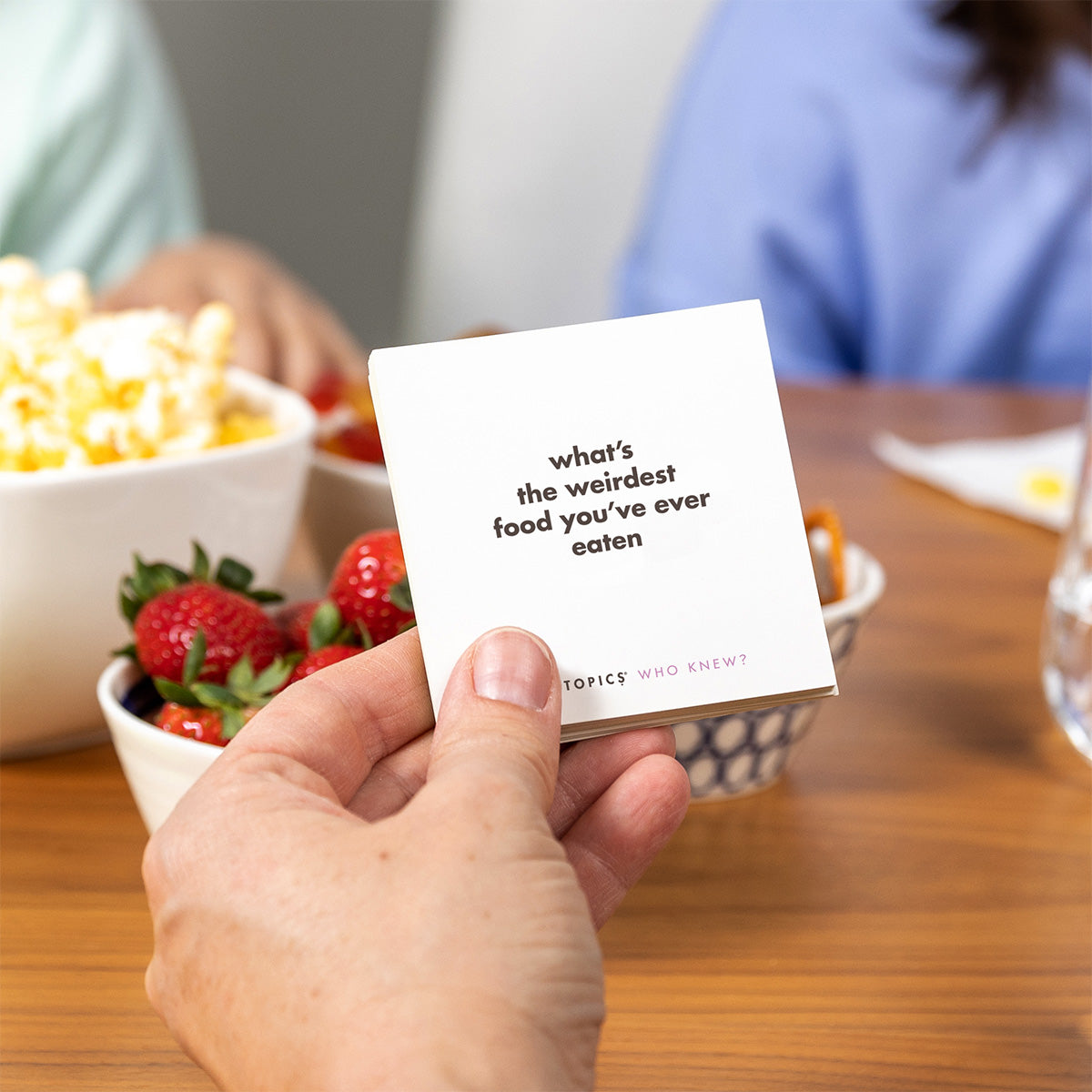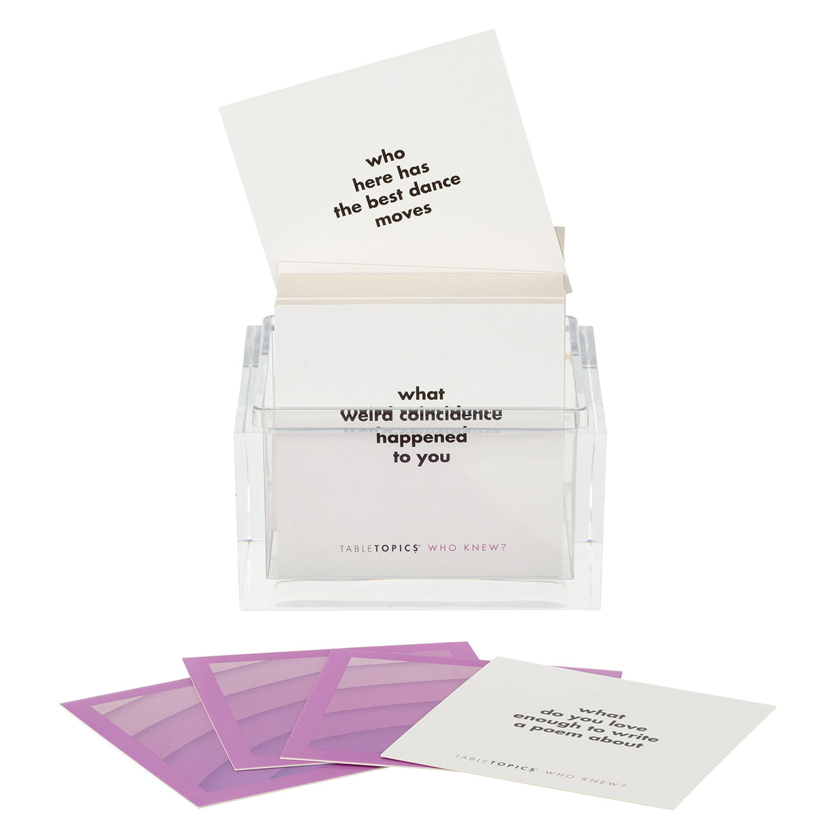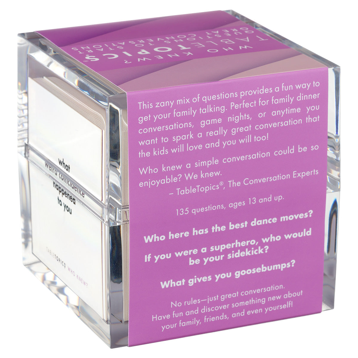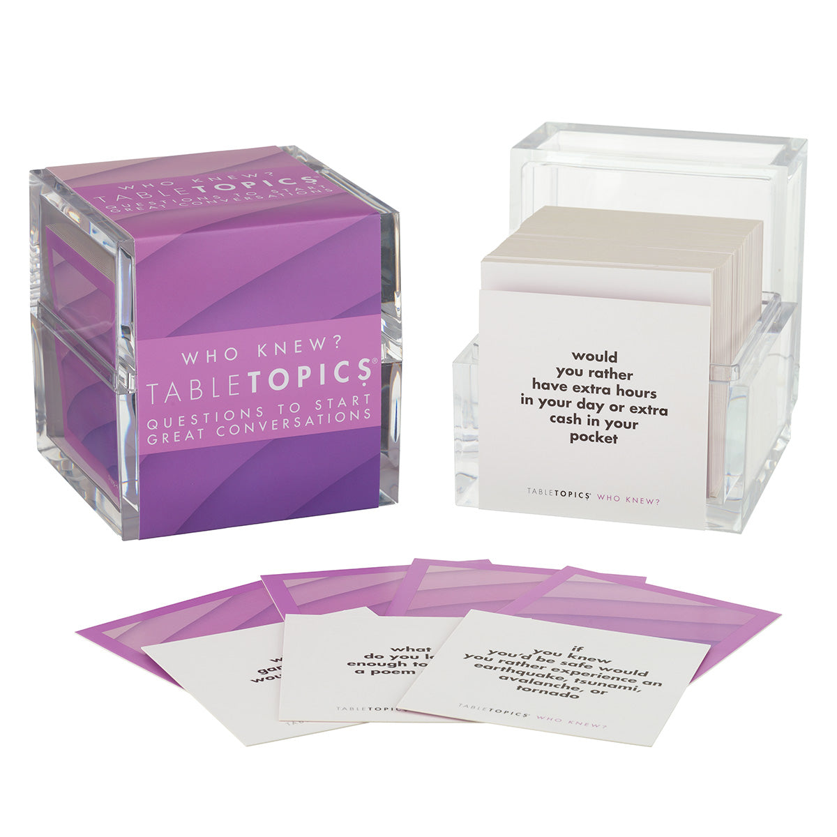 TableTopics® are fun conversation starters for any and every occasion. Our thought-provoking questions have helped millions of people spark engaging, meaningful conversations. Each themed conversation starter set and Prompted™ Journal is full of questions you would have never thought to ask, and the best part is that you’ll get to know your friends, family, and even yourself better. So, skip the small talk — enjoy connecting through great conversation.