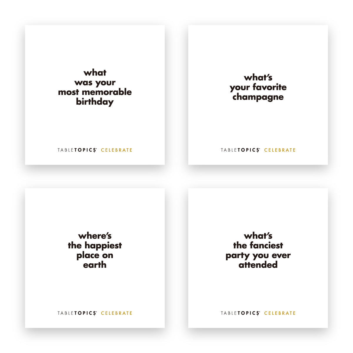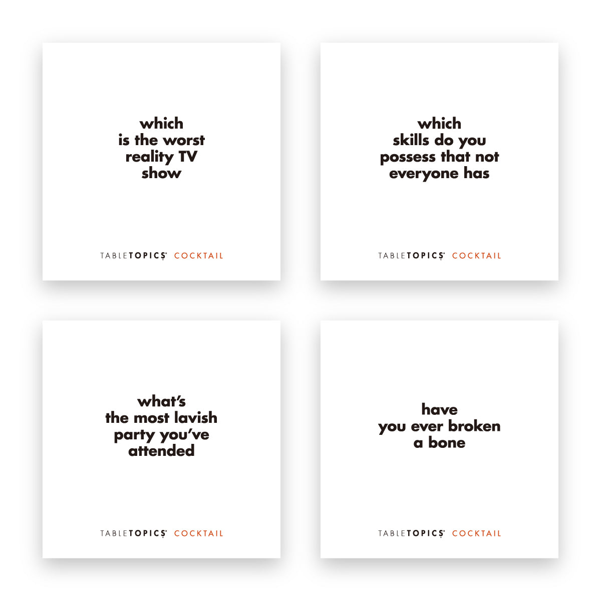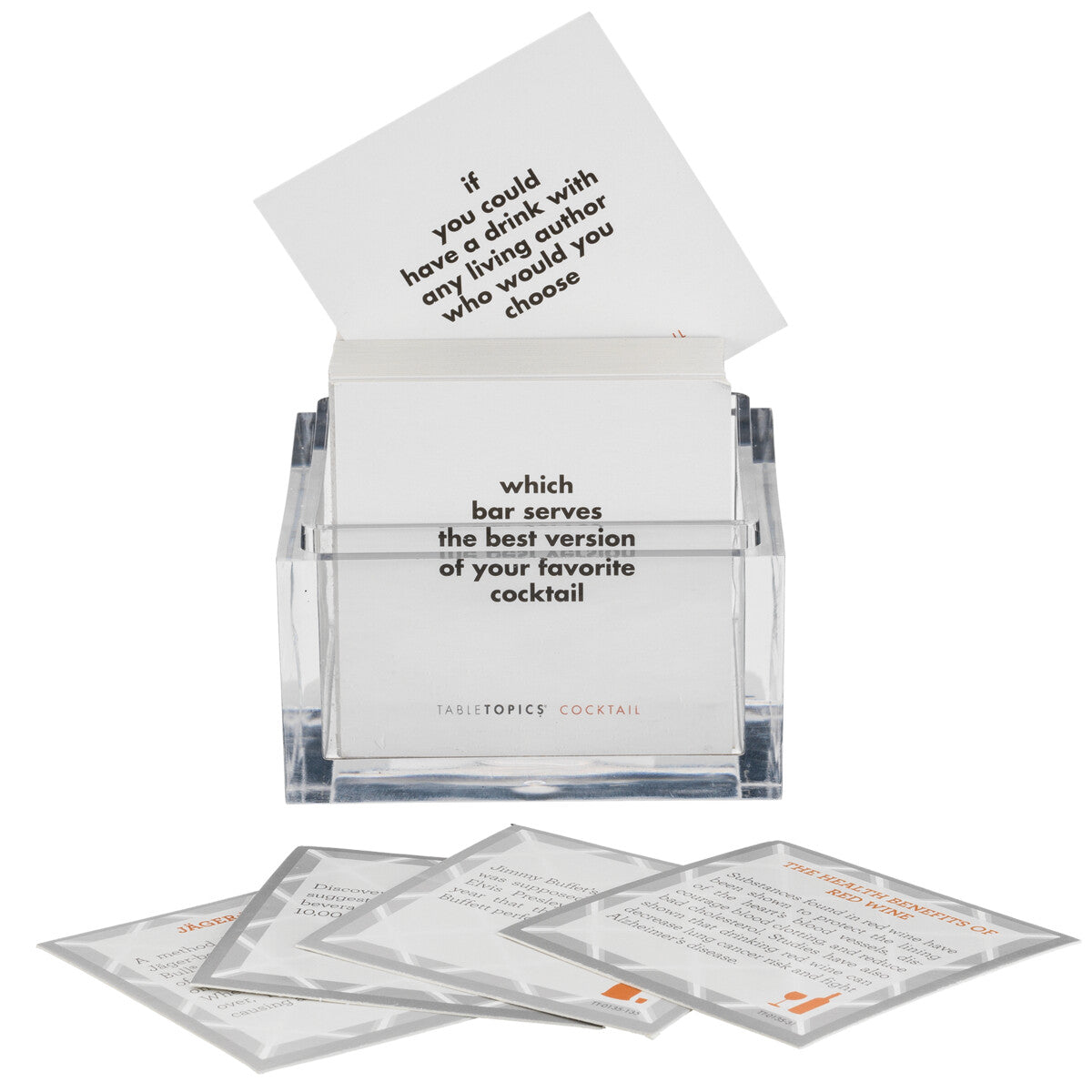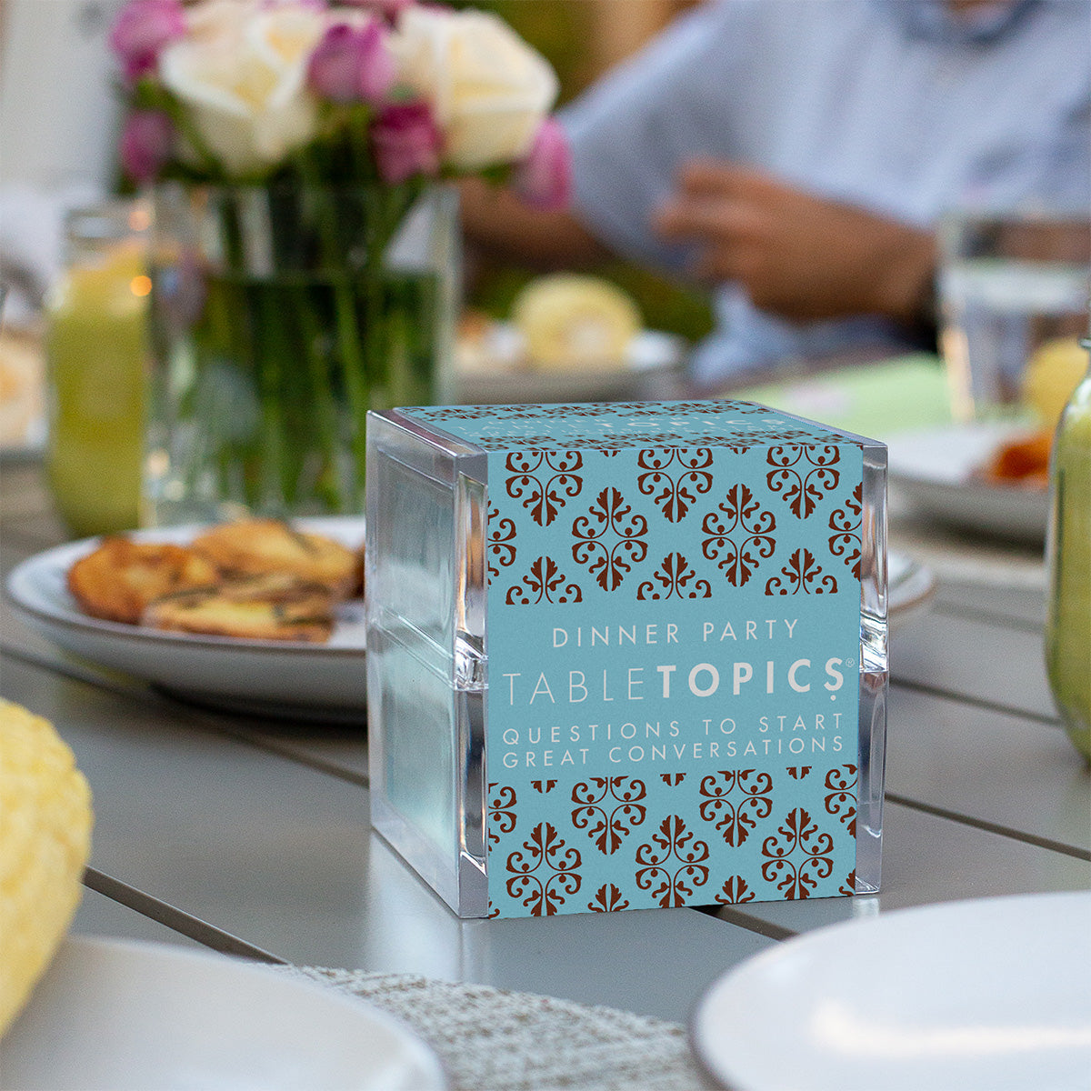 To encourage engaging conversations, put a TableTopics card at each place setting. We offer Conversation Starter card sets for many dinner party themes: Dinner Party, Not Your Mom’s Dinner Party, What Would You Do, and Best Things Ever, among many others!