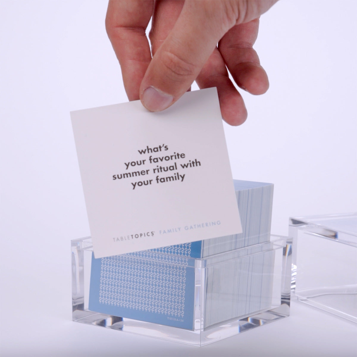 TableTopics® are fun conversation starters for any and every occasion. Our thought-provoking questions have helped millions of people spark engaging, meaningful conversations. Each themed conversation starter set and Prompted™ Journal is full of questions you would have never thought to ask, and the best part is that you’ll get to know your friends, family, and even yourself better. So, skip the small talk — enjoy connecting through great conversation.