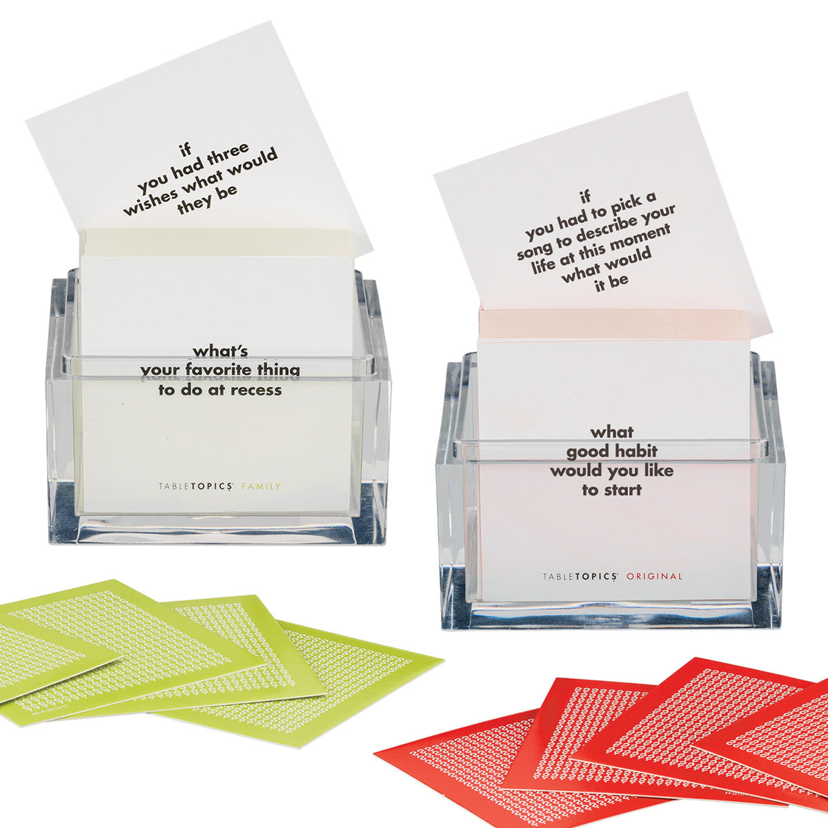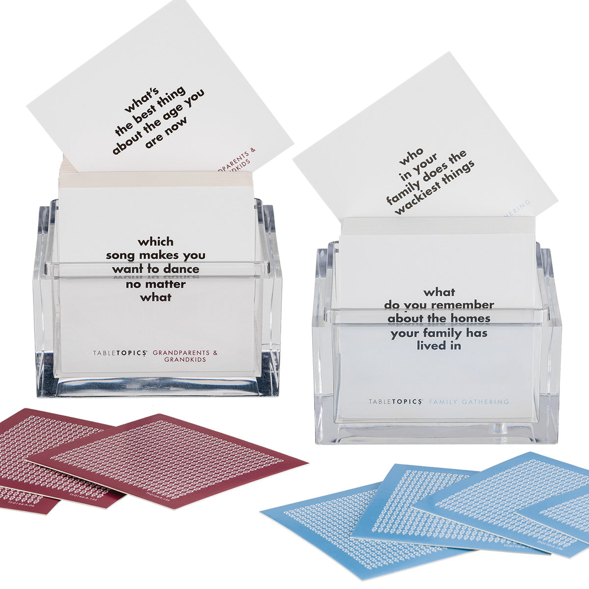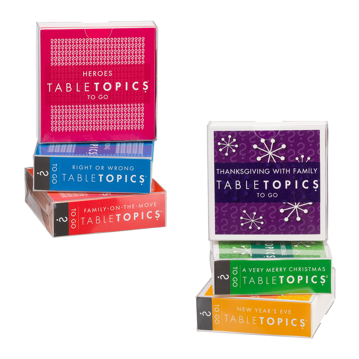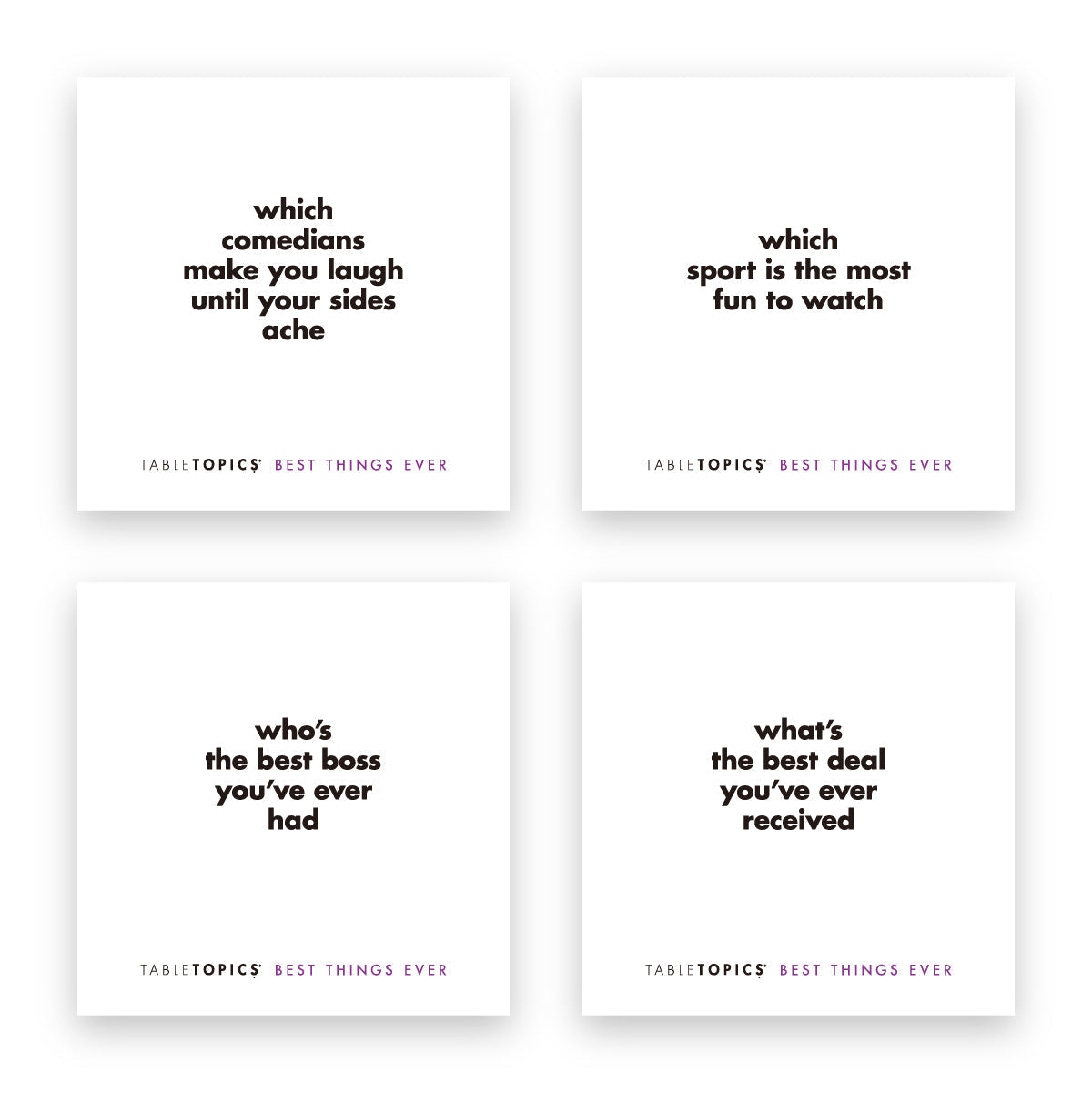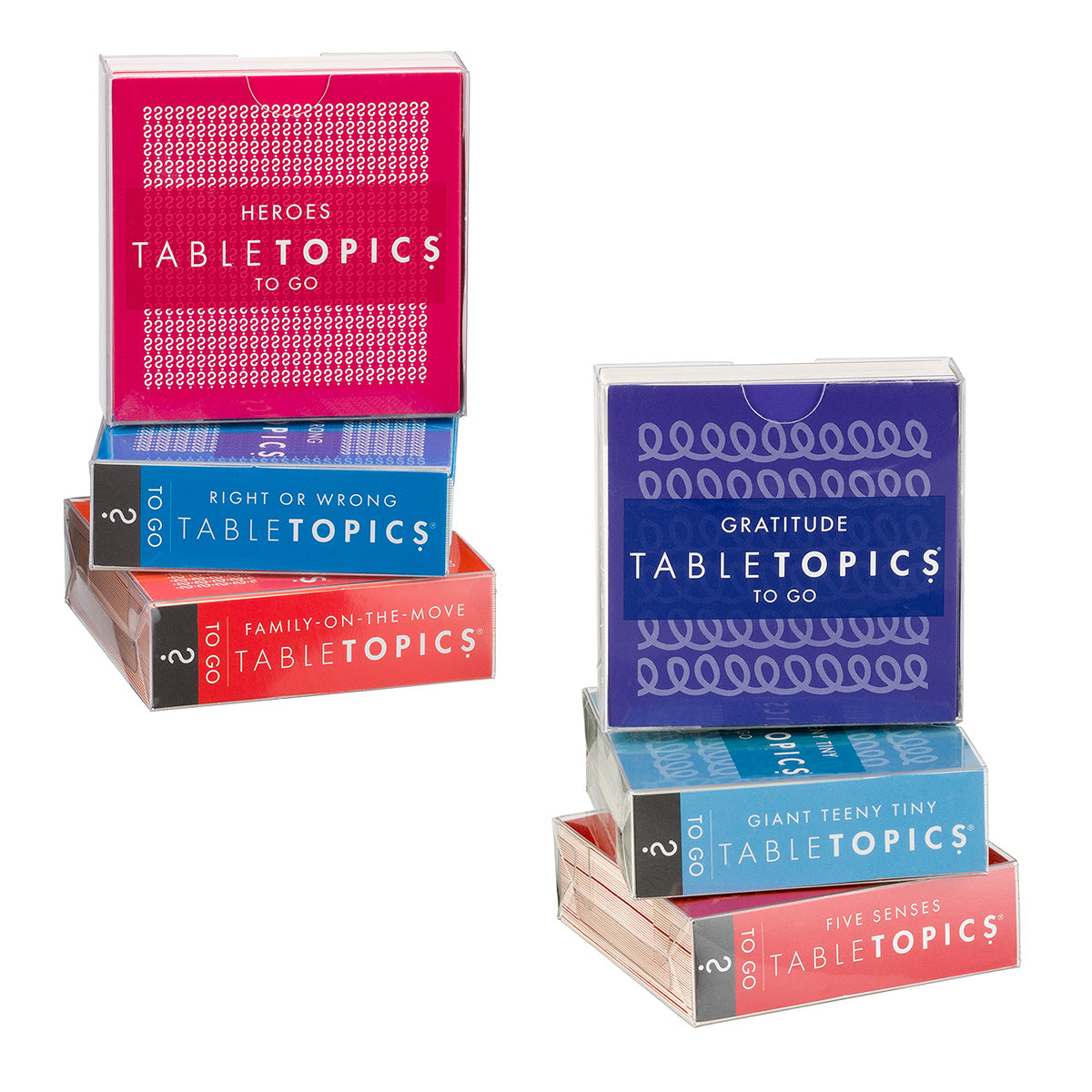 TableTopics® sets are fun conversation starters for any and every occasion. Our thought-provoking questions have helped millions of people spark engaging, meaningful conversations. Each themed set is full of questions you would have never thought to ask, and the best part is that you’ll get to know your friends and family even better. So, skip the small talk — enjoy connecting through great conversation.