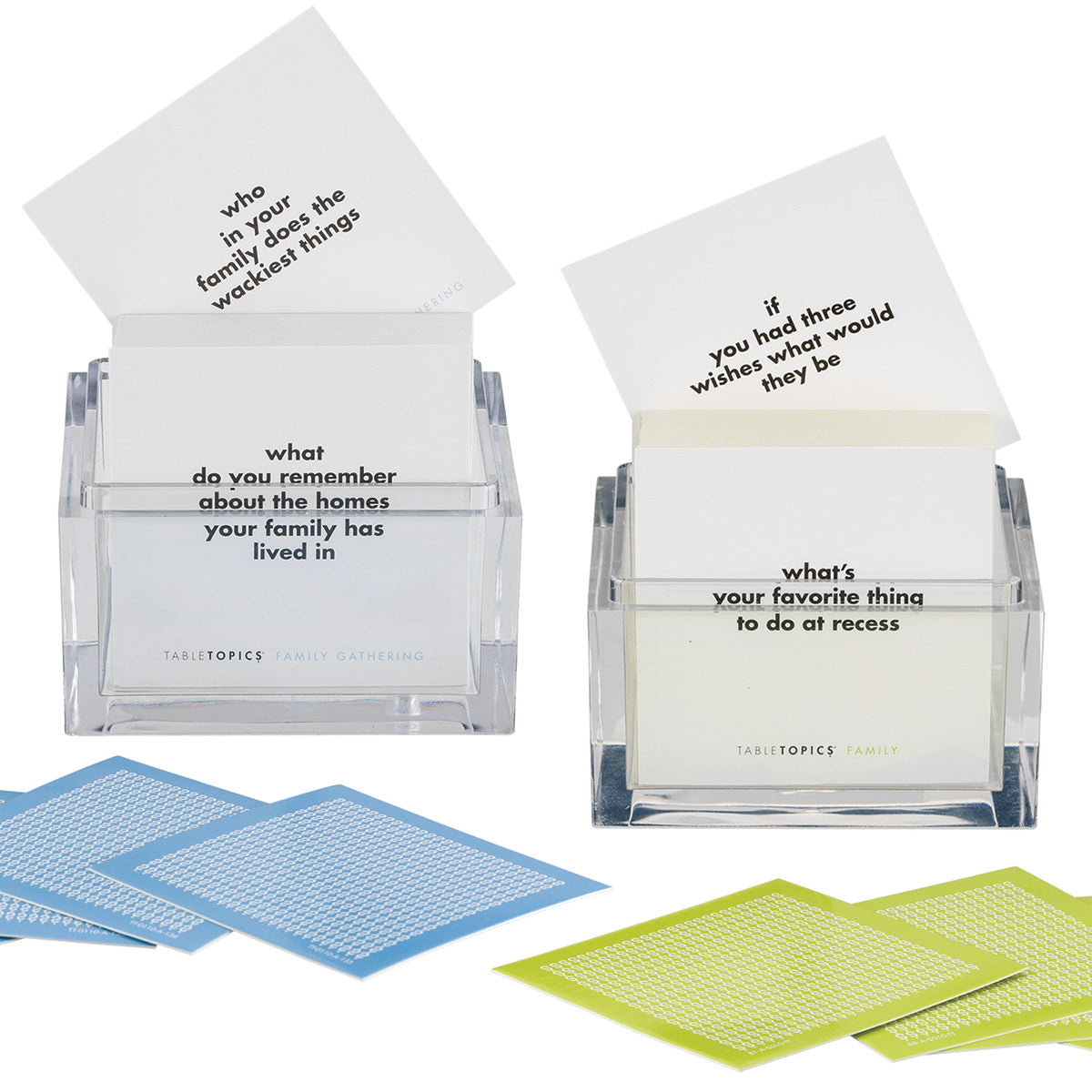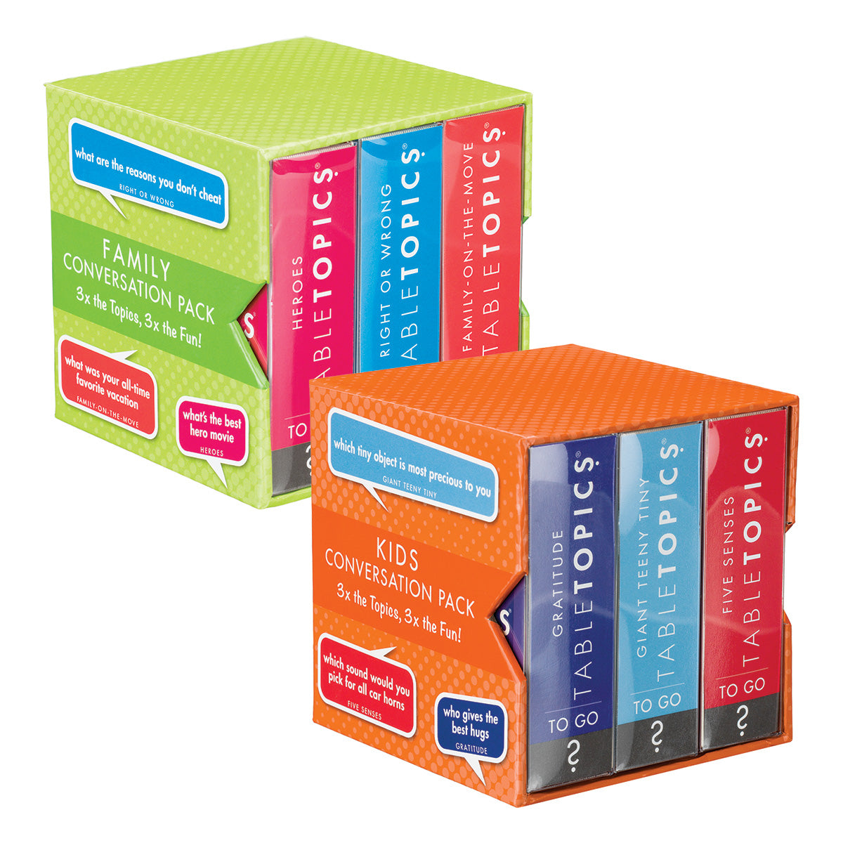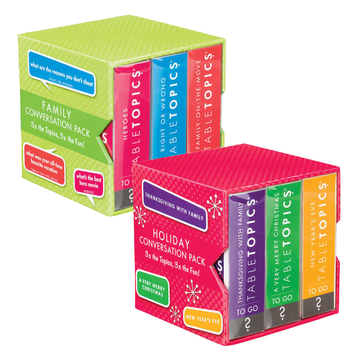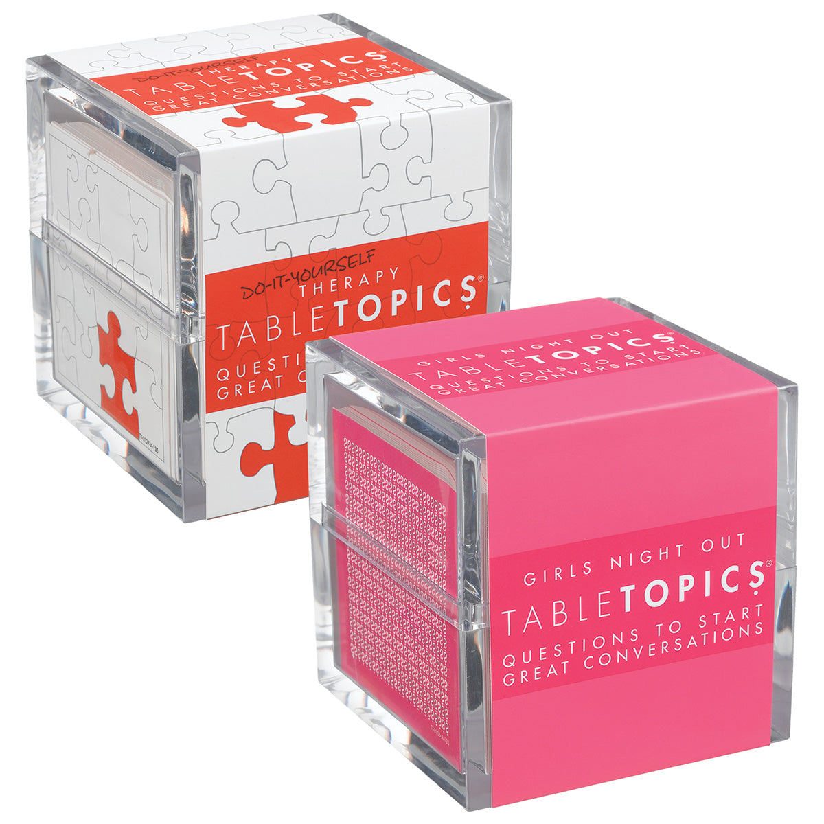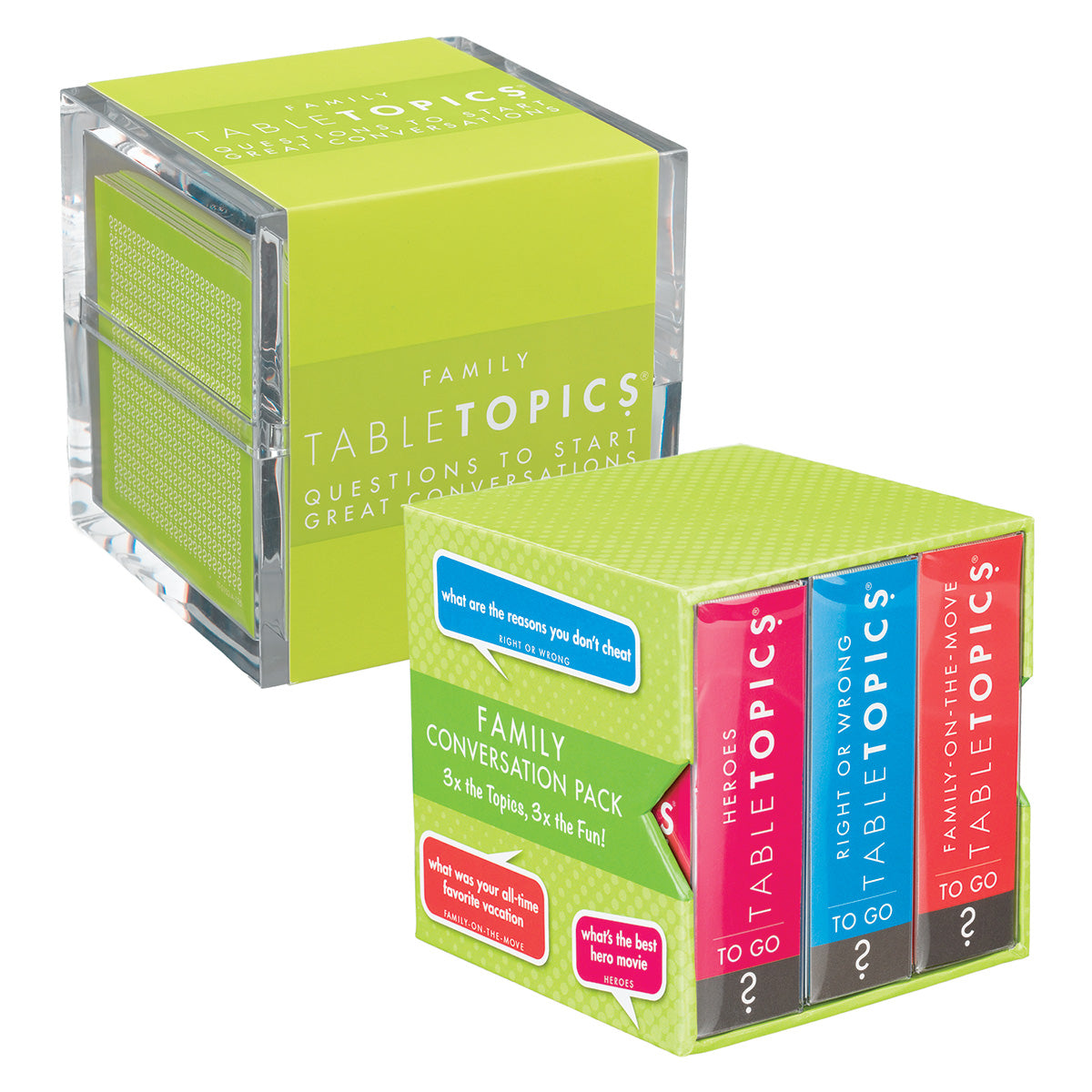 TableTopics® sets are fun conversation starters for any and every occasion. Our thought-provoking questions have helped millions of people spark engaging, meaningful conversations. Each themed set is full of questions you would have never thought to ask, and the best part is that you’ll get to know your friends and family even better. So, skip the small talk — enjoy connecting through great conversation.