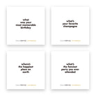 Sample Questions: Which song puts you in a good mood no matter what? If you could invite all of your friends to an all-expense paid party, what kind would you throw? Who or what is sure to make you laugh?