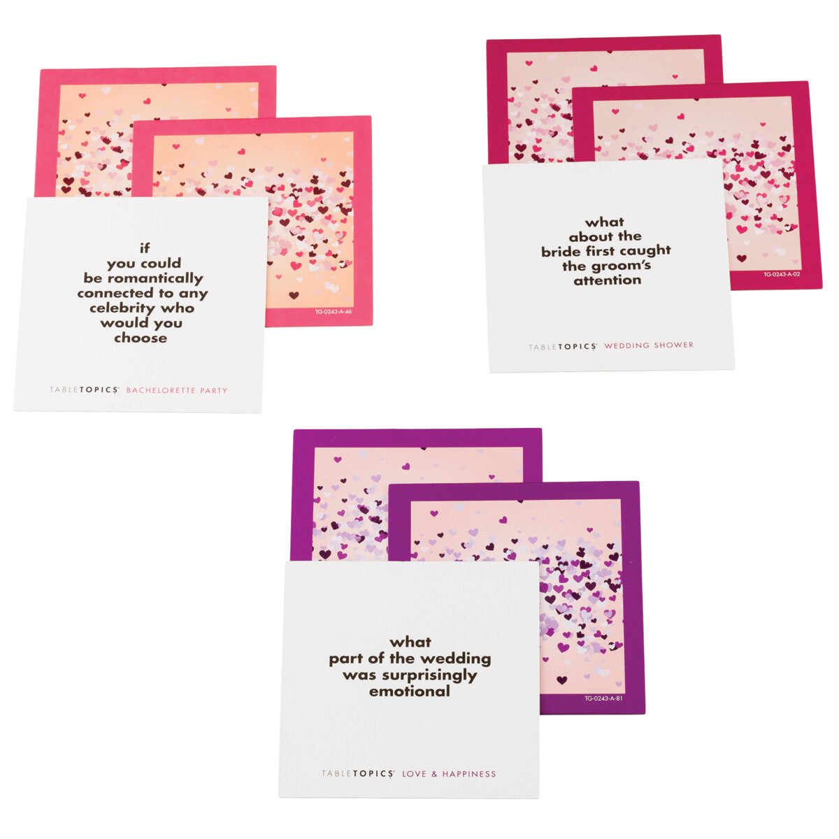 Three Themes: Wedding Shower has questions aimed at giving the happy couple love, laughs, and sage advice. Bachelorette Party is for the girls and features wild, funny, and racy topics to keep the laughs going all night. Love & Happiness includes sweet and romantic questions for newlyweds, perfect for cozy pillow talk and special moments after the big day.