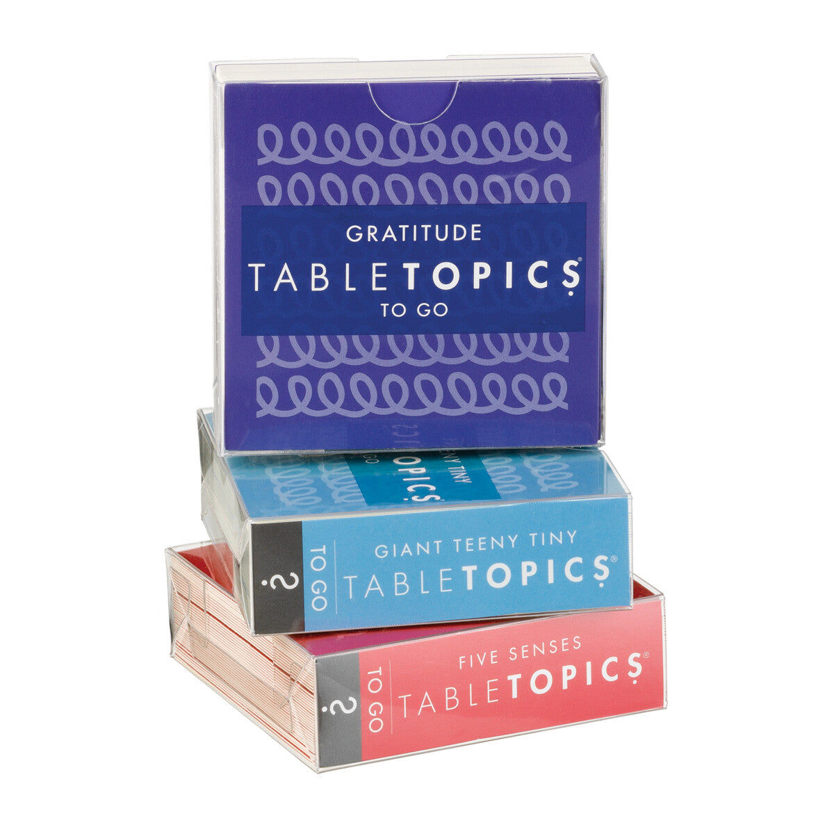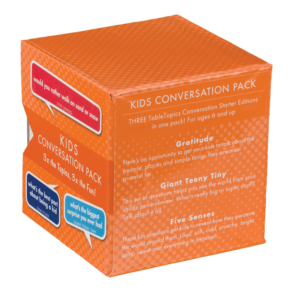 Kids Game: The Kids Conversation Pack is a boxed set of three 40-card To Go card decks on different topics. Take the whole pack together or separate To Go decks. Either way, it’s easy to take these kids’ conversation cards on the go!